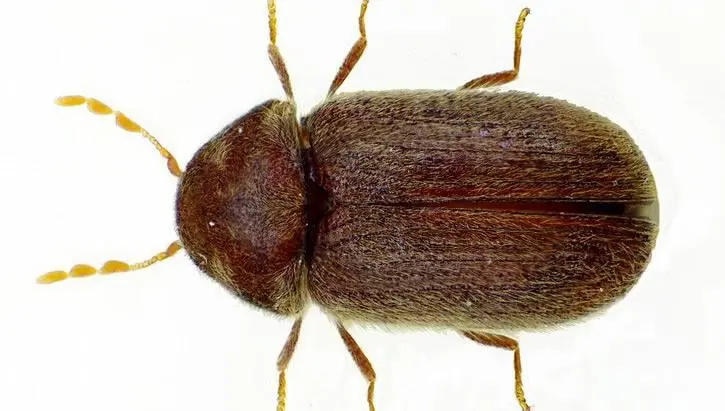 Farbe: hell- bis dunkelbraun gefärbter Käfer, goldgelbe Behaarung auf Deckenflügel